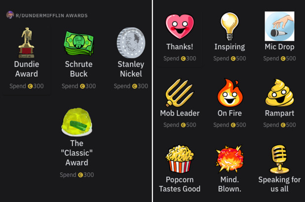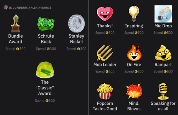 The site test ran the concept on its r/DunderMifflin subreddit, which floated honors such as the Dundie Award, Schrute Buck, Stanley Nickel and The “Classic” Award Award — all inside jokes taken from cult favorite NBC series “The Office.”